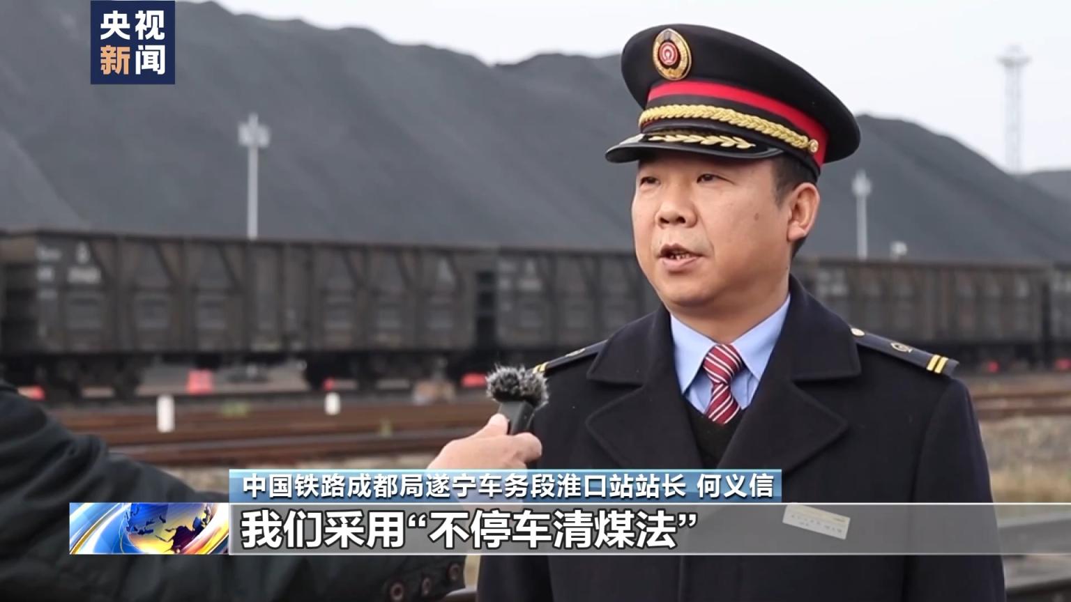 中国铁路成都局遂宁车务段淮口站站长 何义信:我们采用“不停车清煤法”,将原来每卸20辆车就要进行清煤作业,改为现在的翻车机作业同步进行清煤作业,大幅缩短了卸煤作业时间。