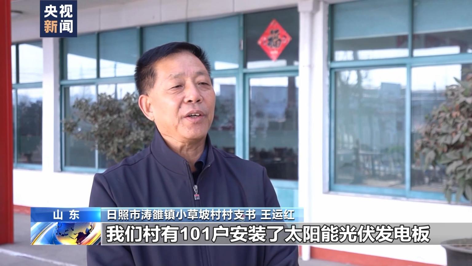 山东省日照市涛雒镇小草坡村村支书 王运红:我们村有101户安装了太阳能光伏发电板,并完成了“煤改电”改造。今年冬天村民用上了清洁取暖,取暖用电基本上零费用,剩余电能还可以并入国家电网,为村民集体增收30多万元。