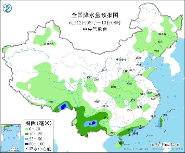 未来三天,华南、云南等地部分地区有中到大雨,局地有暴雨或大暴雨,小时雨量20~50毫米,局地可达80毫米以上。预计,6月10日08时至11日08时,广西东南部沿海、广东西南部和东南部沿海、海南岛西部和北部、福建东南部、云南西部、西藏东南部、川西高原南部、江苏中部等地部分地区有大到暴雨,其中,广西东南部沿海、广东西南部、海南岛北部等地部分地区有大暴雨(100~200毫米)。上述部分地区伴有短时强降水(最大小时降雨量20~50毫米,局地可超过60毫米),局地有雷暴大风等强对流天气。中央气象台6月10日06时继续发布暴雨黄色预警(见图1)。