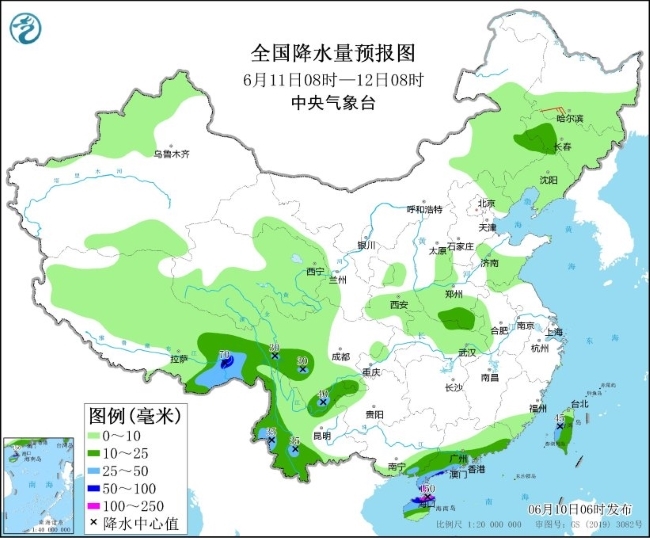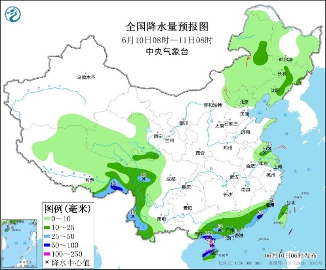 6月10日08时至11日08时,内蒙古东北部、吉林中部、辽宁东部、江苏中部、广西东部、广东大部、福建东南部、海南岛、台湾岛、西藏东南部、川西高原南部、云南西部等地部分地区有中到大雨,其中,广西东南部、广东西南部、海南岛西部和北部、福建东南部、西藏东南部等地部分地区有暴雨或大暴雨(100~200毫米)。内蒙古东部等地部分地区有4~6级风(见图2)。