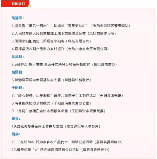 【宝鸡12个项目被列入全省2021年网络公益工程重点项目】近日,陕西省委网信办公布了2021年陕西网络公益工程重点项目,我市各县区上报的网络公益项目中,12个优秀项目入选。