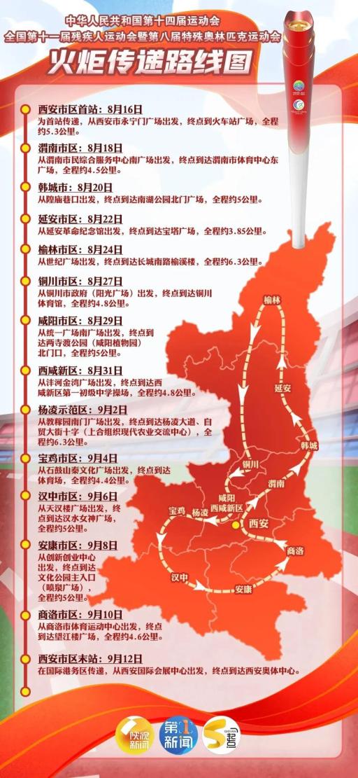 【十四运会和残特奥会火炬9月4日在宝鸡传递!】8月16日,十四运会和残特奥会火炬传递活动在西安主城区进行,全运会和残特奥会同城同期举办“两火合一”的火炬传递方式也是史上首次。9月4日,火炬将在宝鸡市区传递,从石鼓山秦文化广场出发,终点到达体育场,全程约4.4公里。