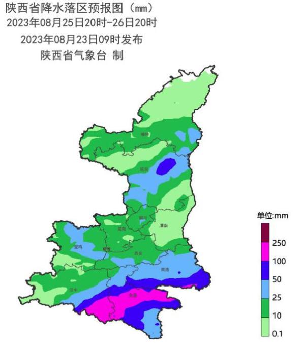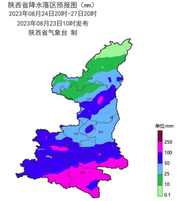 预计25-27日将有3个暴雨日,累计降水量:陕北北部10~25毫米,局地40~60毫米,陕北南部、关中25~60毫米、局地60~100毫米,陕南60~150毫米,其中陕南南部150~200毫米,局地可达250毫米以上。