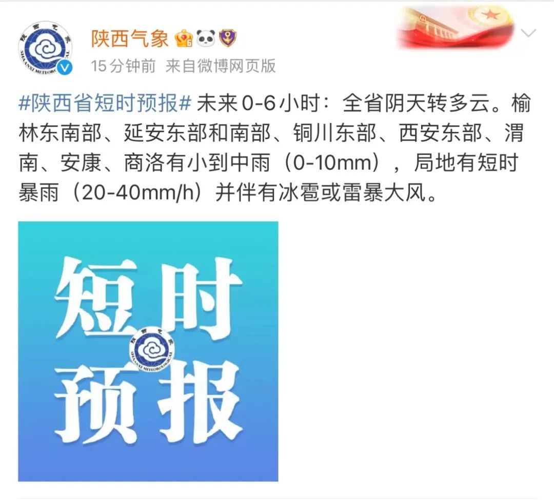 未来0-6小时:全省阴天转多云。榆林东南部、延安东部和南部、铜川东部、西安东部、渭南、安康、商洛有小到中雨(0-10mm),局地有短时暴雨(20-40mm/h)并伴有冰雹或雷暴大风。