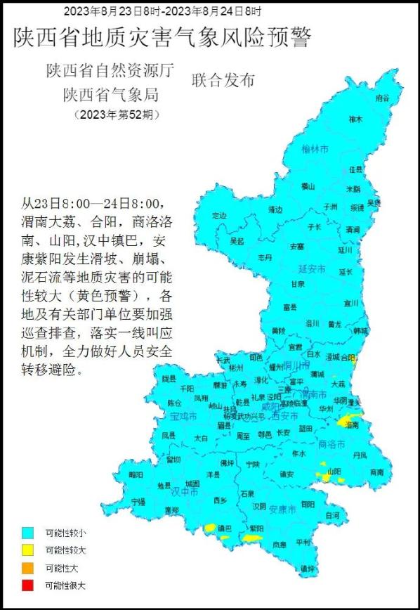 预计2023年8月23日8时至2023年8月24日8时,渭南大荔、合阳,商洛洛南、山阳,汉中镇巴,安康紫阳发生滑坡、崩塌、泥石流等地质灾害的可能性较大(黄色预警),各地及有关部门单位要加强巡查排查,落实一线叫应机制,全力做好人员安全转移避险。