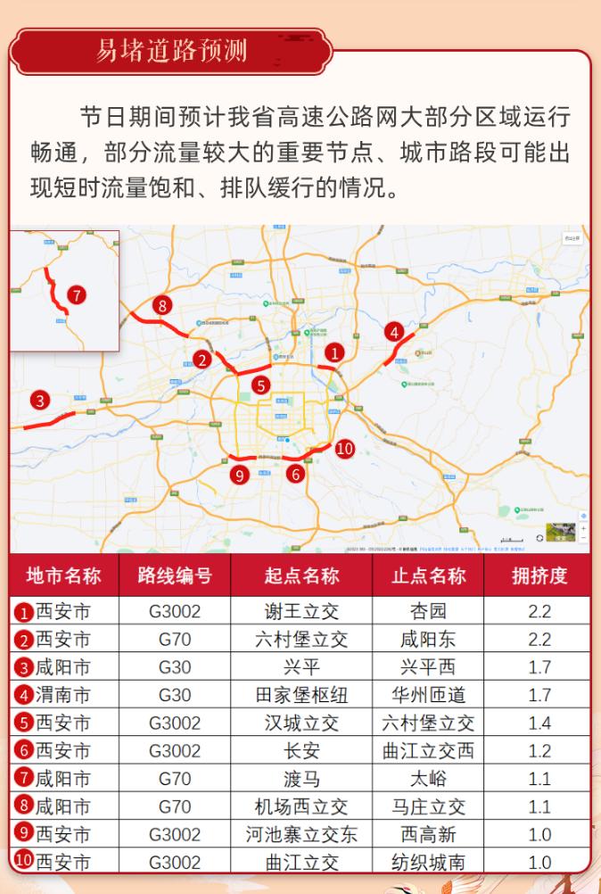 三是部分重点时段、路段小客车与货车出行叠加,客货车混行集中,高速公路车多缓行,易发生多车相撞、二次事故,特别是西安周边连霍、包茂、京昆、福银等高速公路主干路网密集、流量集中,安全风险更加突出。