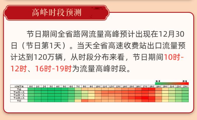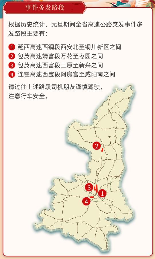 元旦假期,跨年贺岁活动多,温泉游、滑雪游、农家乐等旅游出行频繁,省内中短途自驾出行增多。预计我省重要高速公路、西安绕城高速,城市周边通往乡村、民俗旅游点的车辆短时间增加较多。12月29日17:00-20:00,12月30日8:00-10:00将出现出城高峰,1月1日16:00-19:00将出现返城高峰。
