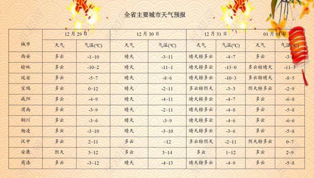 最低气温出现在31日早晨:陕北北部-10~-13℃,陕北南部、秦岭山区-6~-10℃,关中、商洛-2~-4℃,汉中、安康-2~2℃。