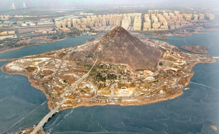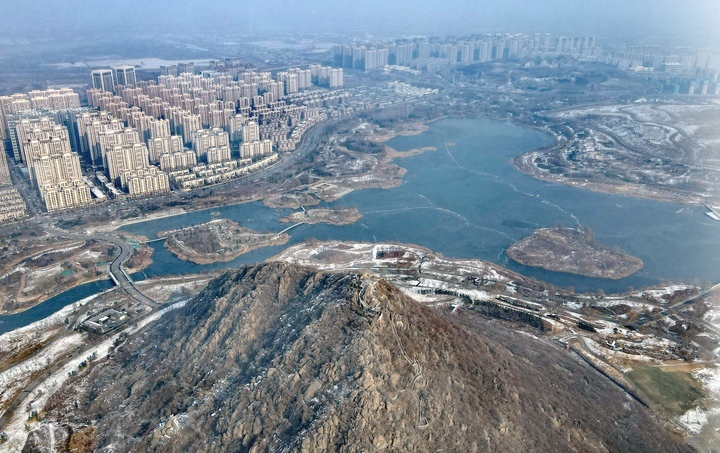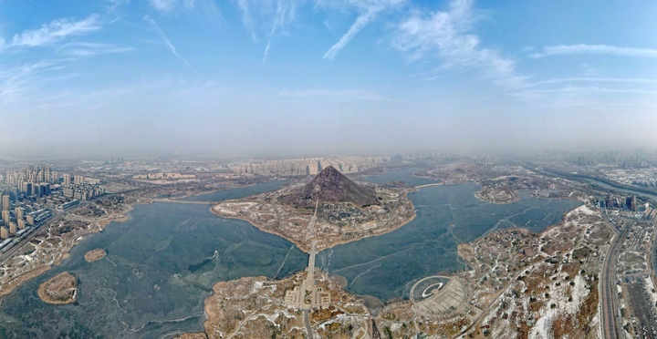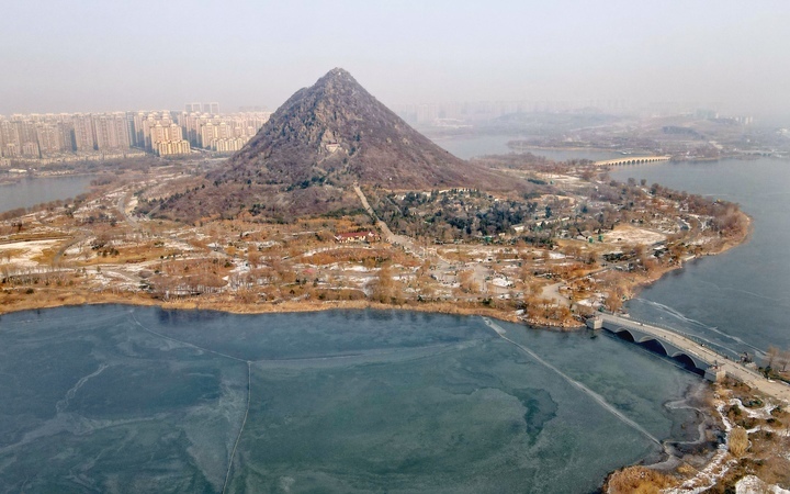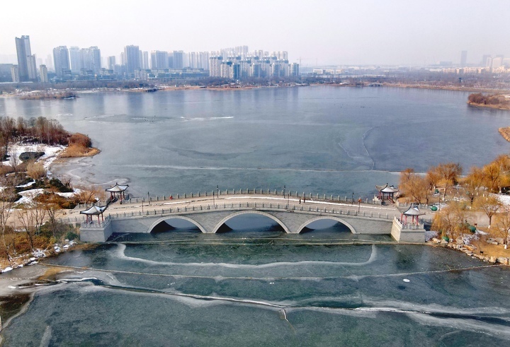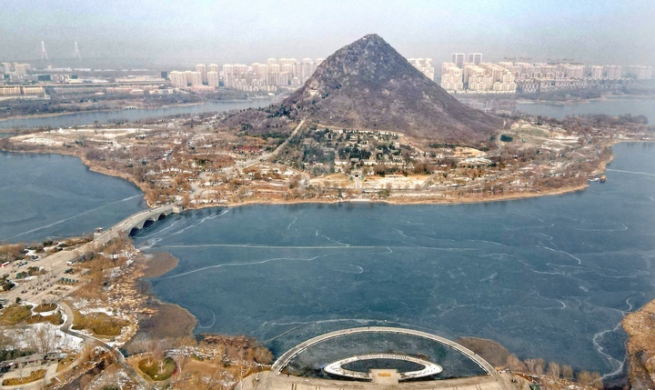 12月26日,寒潮过后的济南华山历史文化湿地公园山静水静,仿佛时间在这里都凝固了,华山湖水面基本全部冰封,在阳光照耀下闪烁着耀眼的光芒,犹如一块巨大的、布满各种条纹的翡翠镶嵌在泉城大地上,构成了一幅富有冬韵的画卷。