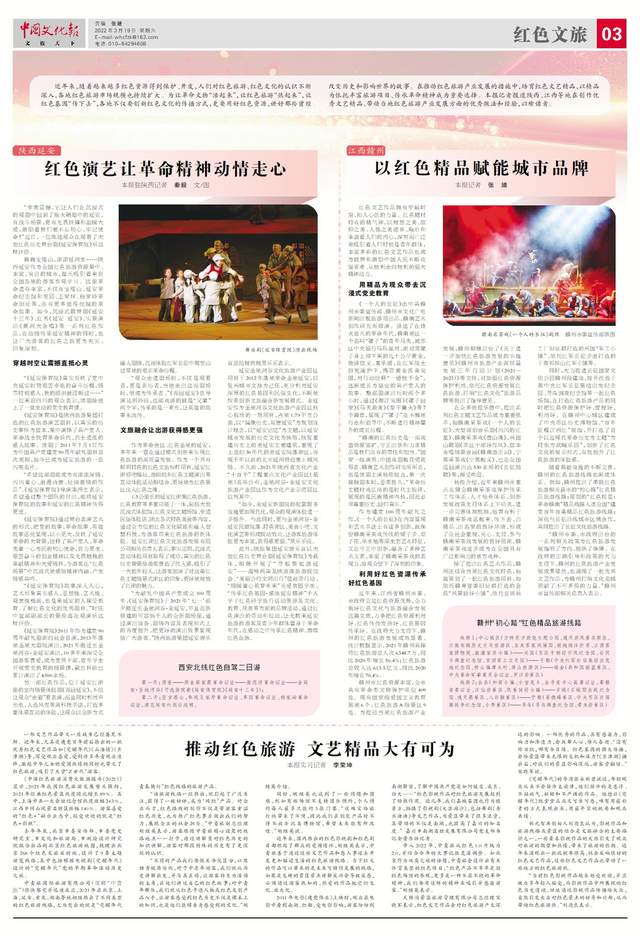 近年来,随着越来越多红色资源得到保护、开发,人们对红色旅游、红色文化的认识不断深入,各地红色旅游市场规模也持续扩大。为让革命文物“活起来”,让红色旅游“热起来”,让红色基因“传下去”,各地不仅要创新红色文化的传播方式,更要用好红色资源,讲好那些曾经改变历史和影响世界的故事。在推动红色旅游产业发展的措施中,培育红色文艺精品,以精品为依托丰富旅游项目、传承革命精神成为重要选择。本端记者报道陕西、江西等地在创作优秀文艺精品、带动当地红色旅游产业发展方面的优秀做法和经验,以飨读者。
