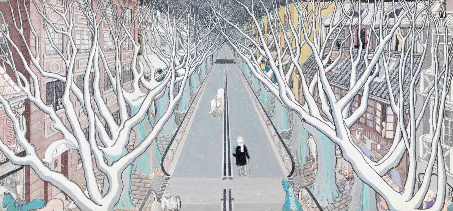 佛手举起的静安寺,巨鹿路安上自动化步道,橱窗里的模特与人共舞……金宇澄画出这些兼具上海特色与超现实主义的画面,呈现既私人又公共的上海“潜意识”。展览“繁花——金宇澄绘画展”正在外滩上海东一美术馆展出,这是画家金宇澄迄今规模最大的一场展览。