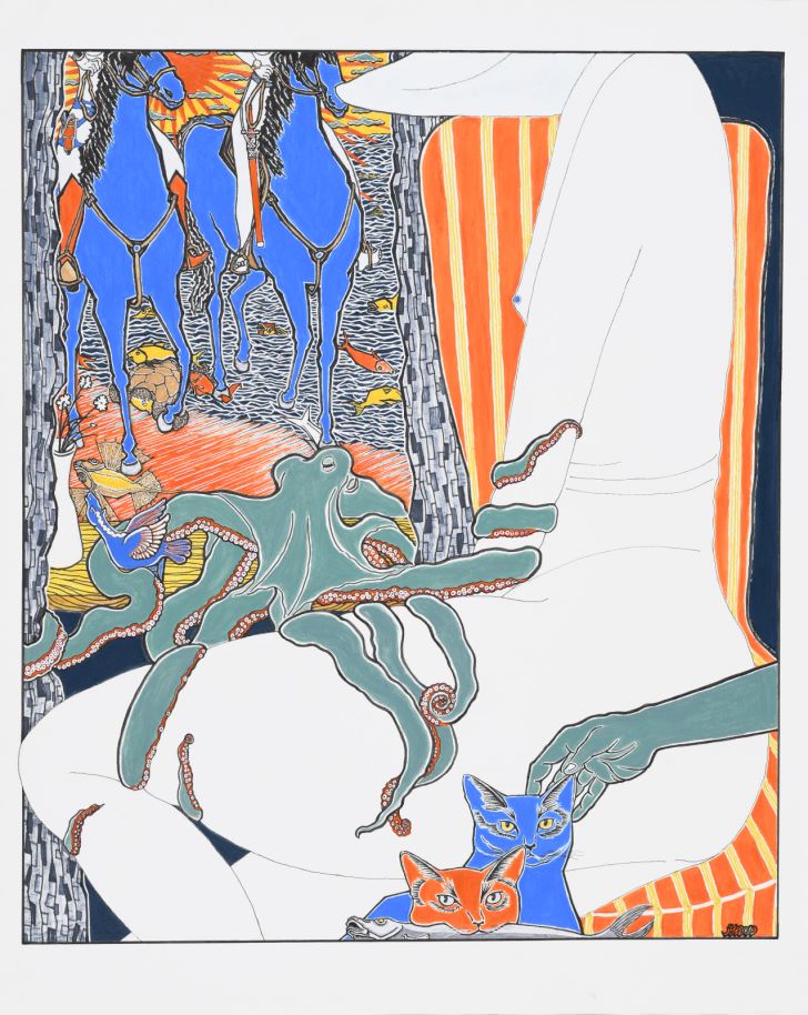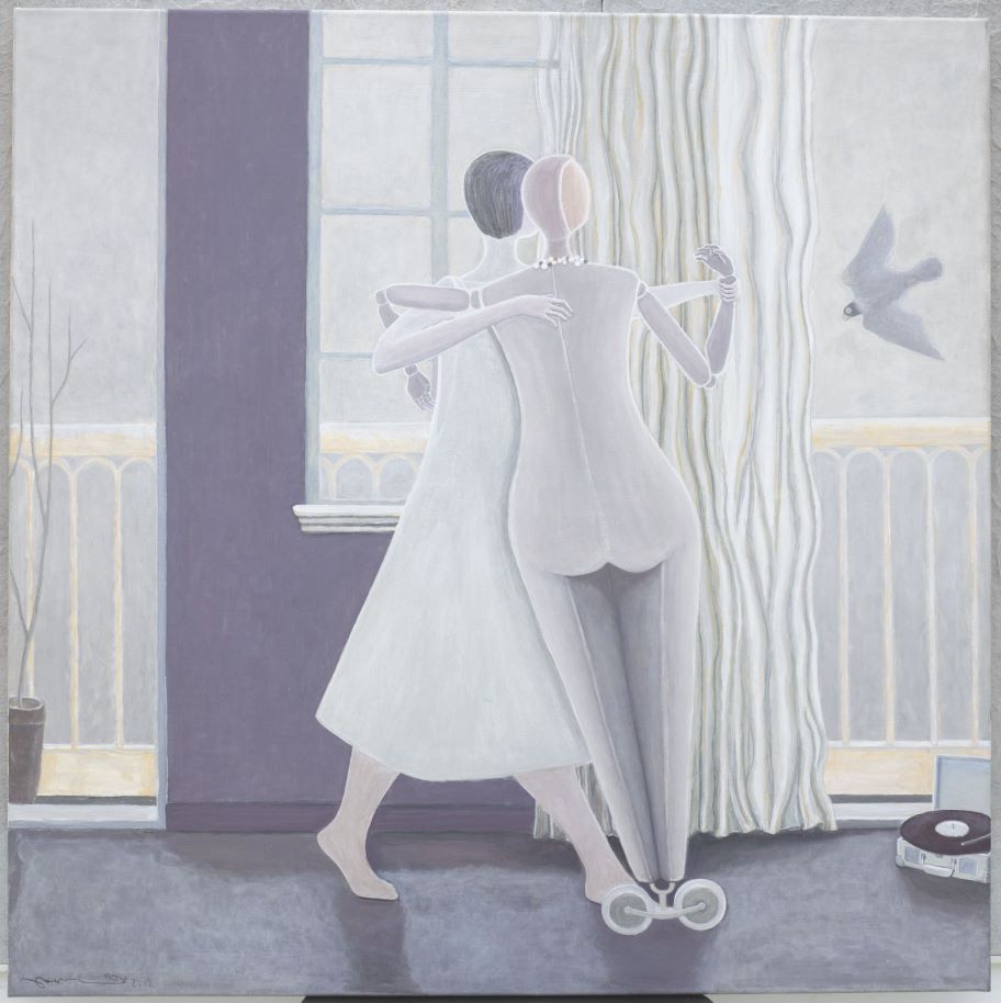 《舞蹈》这幅画也非常有意思,人台站在轮滑上,与人共舞。在我小时候,人台的形式十分简单,无设计感,但现在商场里人台的设计变得更加高级了,形式也更多样化,这也反映了上海摩登生活的变迁。