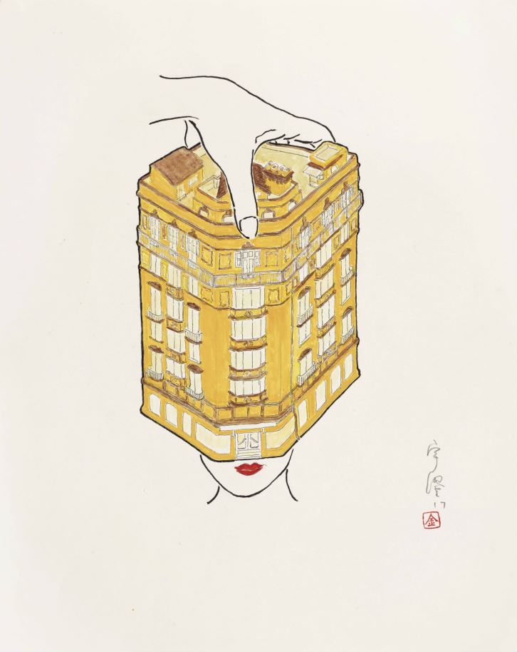直到民国之后,苏州最优秀的人都聚集到了上海。上海有一种魔力,能够将世界各地的优秀人才吸引到这座城市来。在《S公寓》这幅画里,有一只手把一座大楼拎起来,我想表达的是,上海的发展依靠的是外来的力量,五湖四海的人来到上海,闯出了一番天地。
