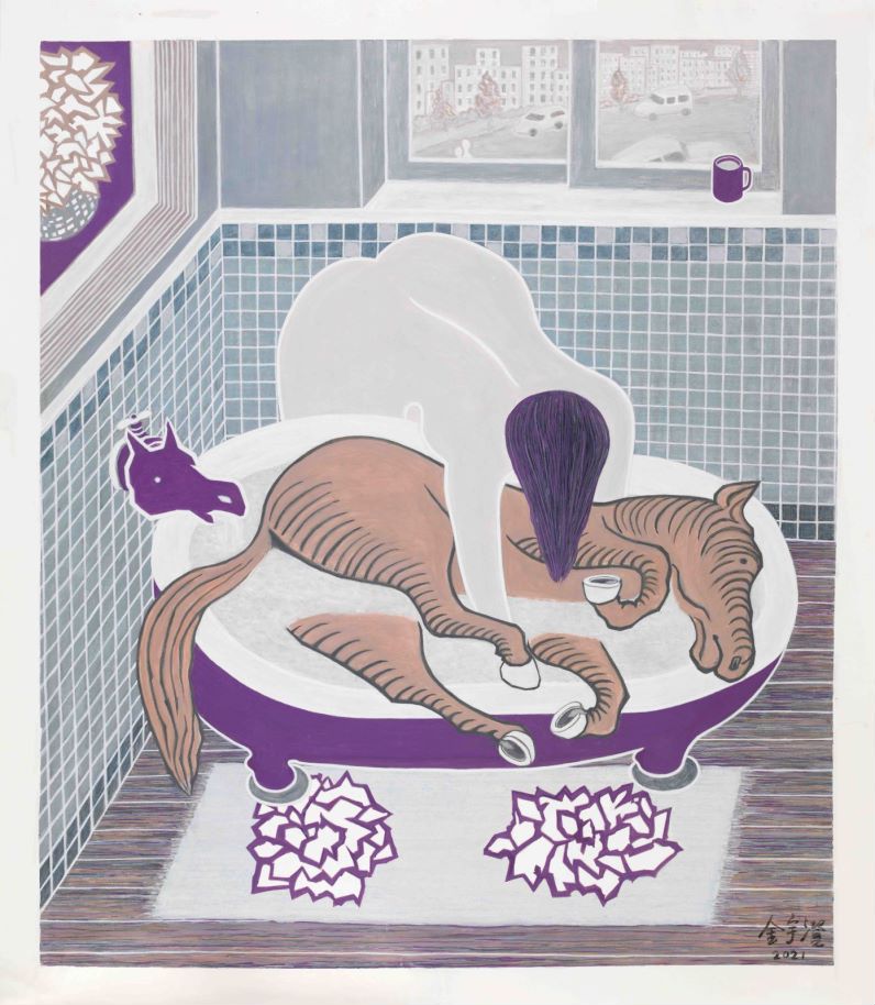 比如《黎里》这幅作品,河水如漂亮的丝带穿过桥,自然地流动,这样的创作灵感非常奇妙。我们擅长做城市更新主题的室内设计,把老的洋房建筑更新为时尚领域地。在金老师的作品里,有铁铸的浴缸、落地窗、橡木地板等场景,都是城市更新在室内场地的重现。我经常频繁往返巴黎和上海,巴黎的很多老建筑里,也有很多类似场景的视觉呈现。