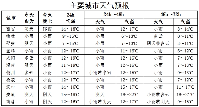 14日:全省阴天间多云,陕北北部、关中西部部分地方有小雨或阵雨,陕北有弱降温吹风天气。