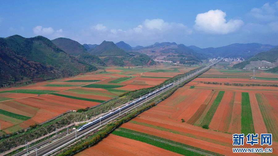 云南省文山州丘北县,和谐号动车穿行在田野之中(资料图)。新华网发(杨紫轩 摄)