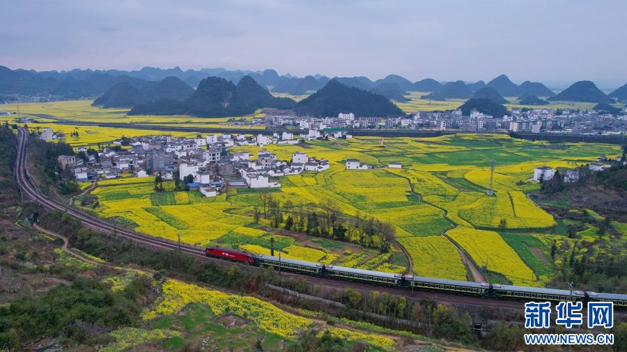 云南省曲靖市罗平县,“赏花专列”穿行在油菜花海中(资料图)。新华网发(杨紫轩 摄)