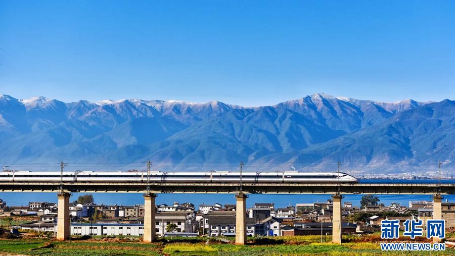 云南省大理州大理市,和谐号动车与洱海“同框”(资料图)。新华网发(徐章位 摄)