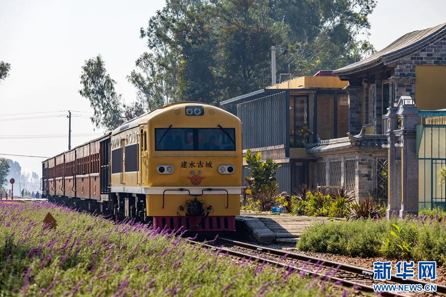 云南省红河州建水县,一列“建水古城号”米轨小火车穿行在线路上,列车由东风型米轨内燃机车牵引,经过改造的木质结构车厢,随手一拍都是美图,深受游客的喜爱(资料图)。新华网发(徐章位 摄)