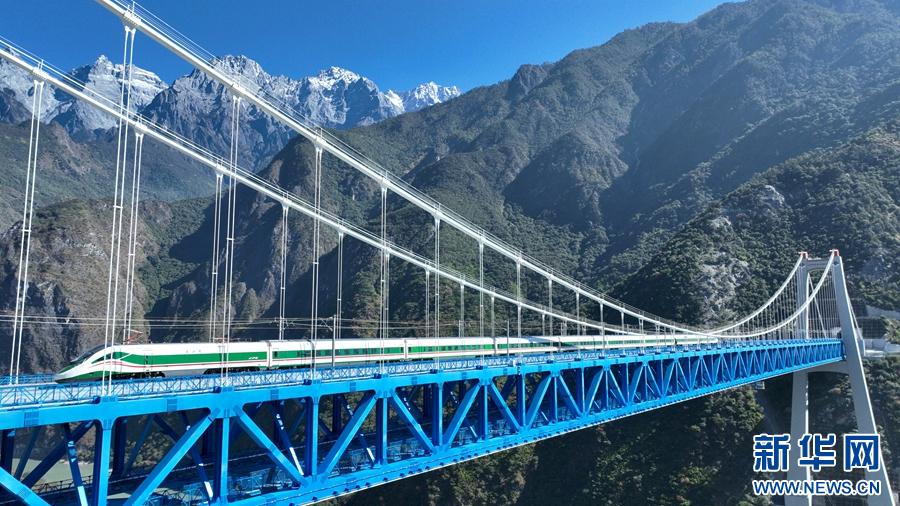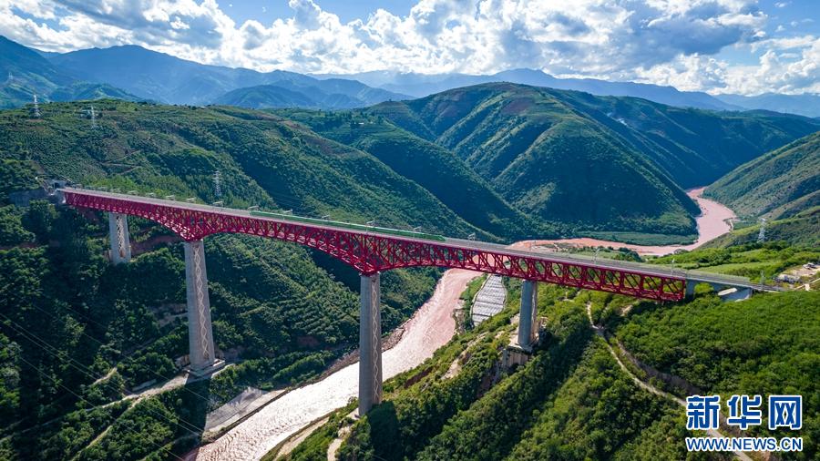 复兴号动车行驶在丽香铁路金沙江特大桥上,该座铁路桥一头连着丽江市玉龙县,一头连着迪庆州香格里拉市(资料图)。新华网发(陈畅 摄)