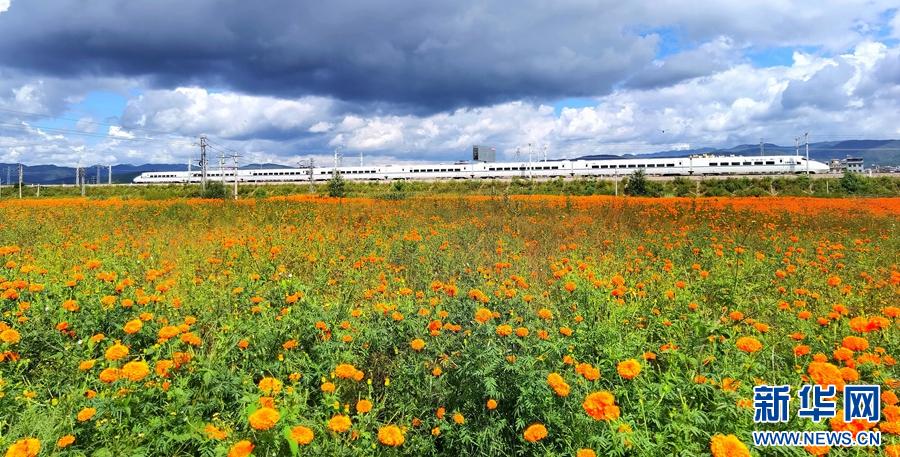 云南省临沧市云县,和谐号动车与一片花海“同框”(资料图)。新华网发(万绍平 摄)