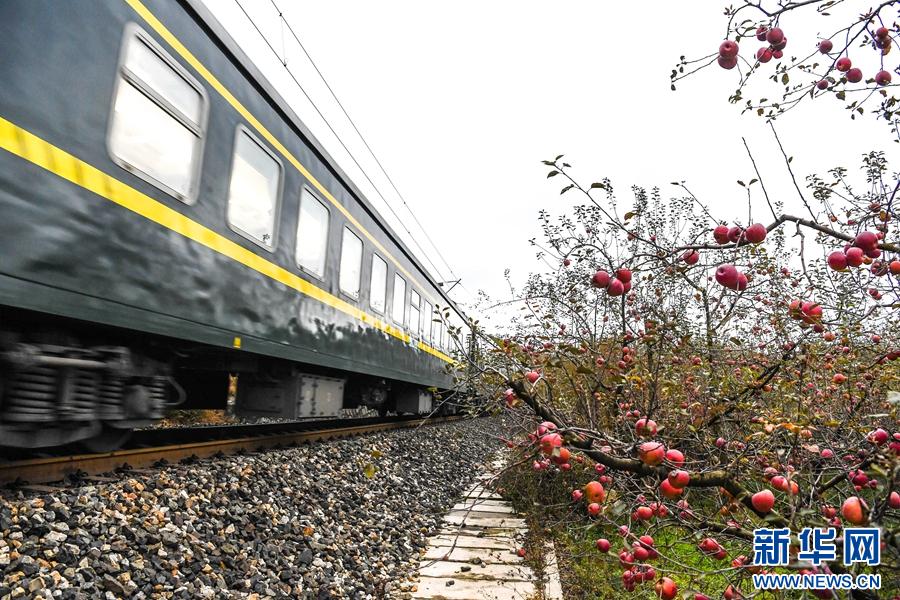 云南省昭通市昭阳区,一列绿皮火车从小龙洞村的苹果园旁驶过。贵州贵阳至云南昭通之间的绿皮“慢火车”,是沿线村民出行的重要交通工具,也是沿线农产品出山的“致富快车”,而列车上最常见的农产品,就是昭通地区盛产的苹果,因此这趟列车又被沿线村民亲切地称为“苹果列车”(资料图)。新华社记者 杨文斌 摄