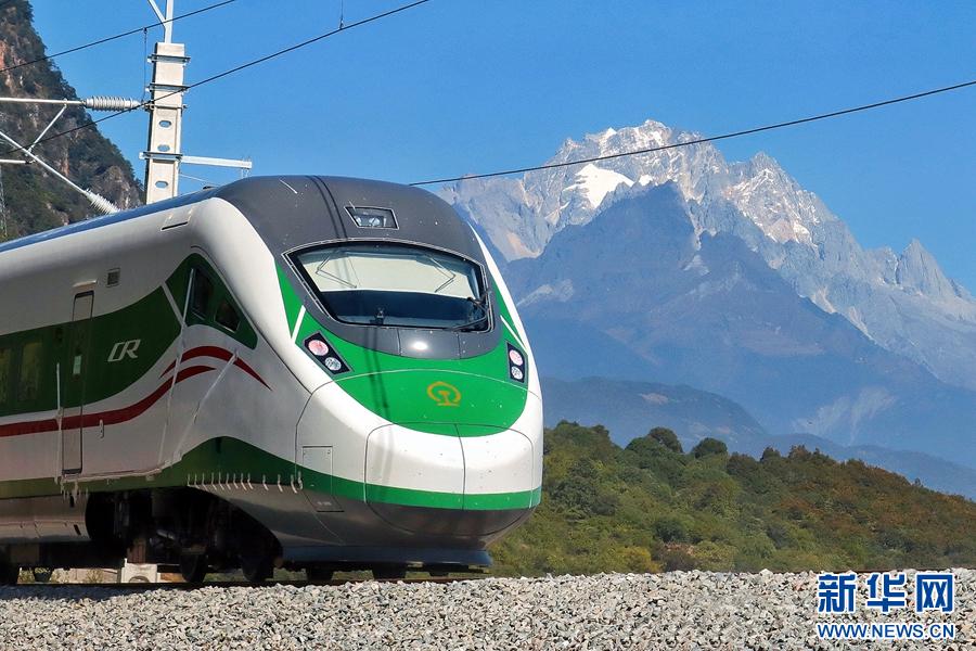 云南省丽江市玉龙县,复兴号动车与玉龙雪山“同框”(资料图)。新华网发(李新 摄)