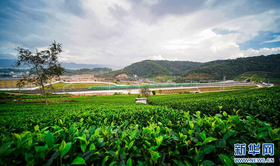 云南省普洱市思茅区,复兴号动车与一片茶园“同框”(资料图)。新华网发(杨林 摄)