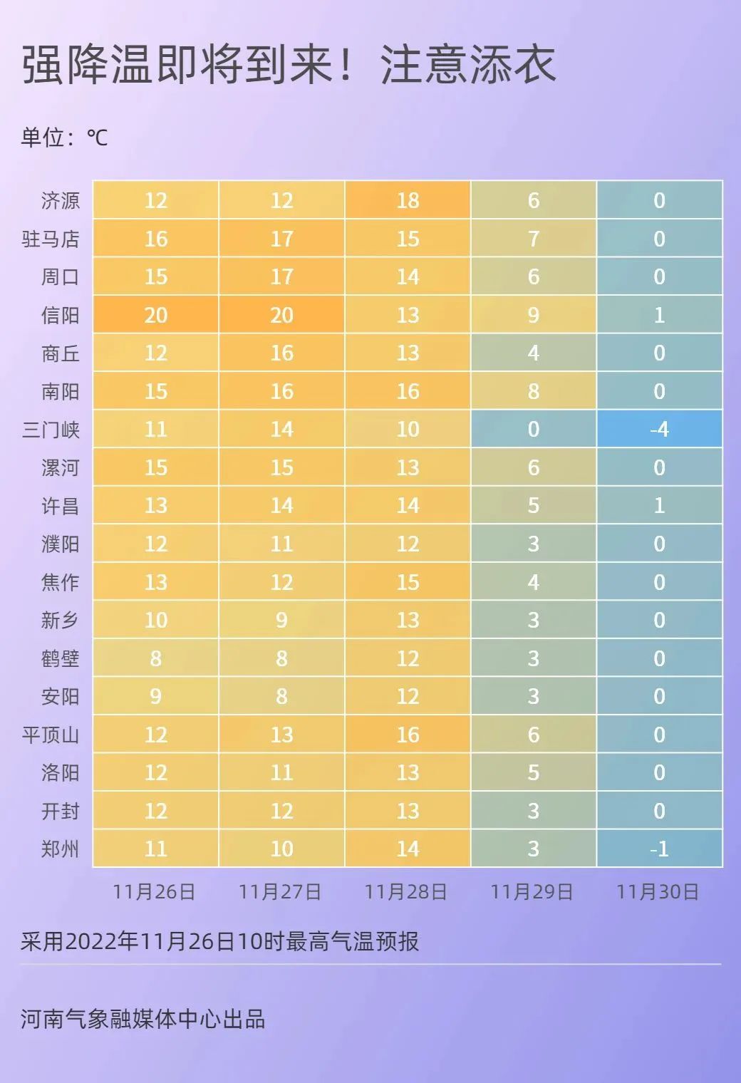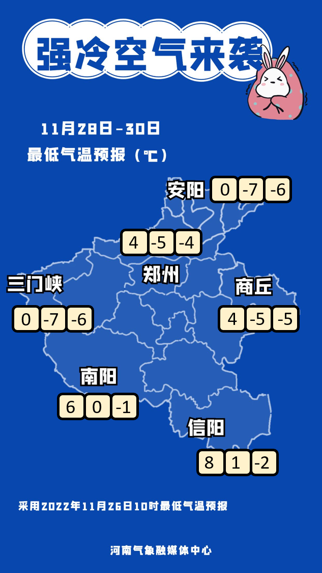 受强冷空气影响,28到30日,全省自北向南偏北风5到6级,阵风7到8级、中西部10级左右;全省大部气温下降12到14度,局部可达16度以上,将出现强寒潮。30日、12月1日和2日早晨全省最低气温西部、北部零下8度到零下6度;其他县市零下5度到零下2度。