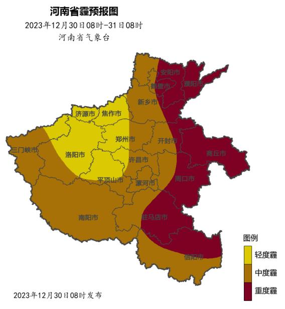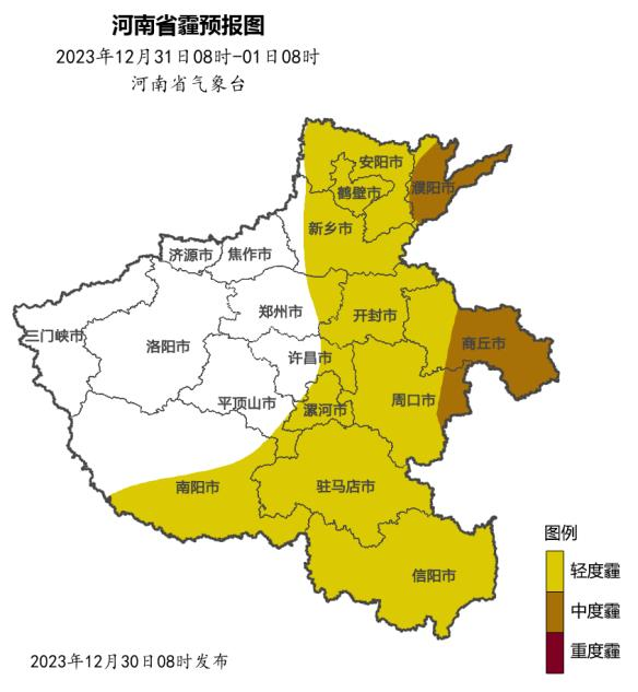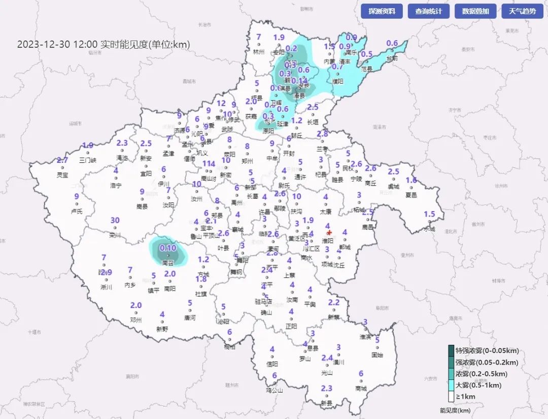29日20时至30日7时,驻马店、信阳、新乡、商丘、周口、安阳、南阳、鹤壁、焦作、濮阳部分县(市、区)出现能见度小于等于200米的强浓雾,其中林州、卫辉、获嘉、永城、郸城、新蔡、固始、南召出现能见度小于等于50米的特强浓雾,最低能见度前三站分别为新蔡23米、固始32米、卫辉36米。