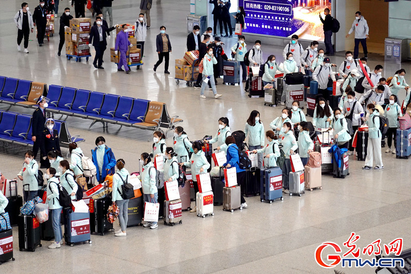 2022年4月15日,医务人员在西安北站内排队进站乘车。 光明网 图