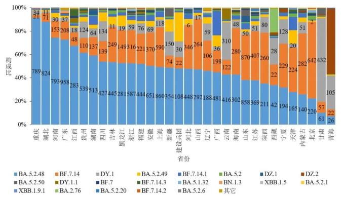总体来看,北京、内蒙古和天津以BF.7及亚分支为优势株;其它省份均以BA.5.2及亚分支为优势株(图4-2)。