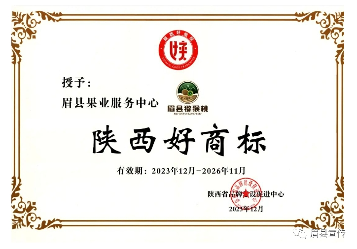 12月26日,2023年陕西省商标品牌发展大会在宝鸡市举行,大会宣布了2023年“陕西好商标”评价结果,“眉县猕猴桃”地理标志证明商标荣获2023年“陕西好商标”称号。