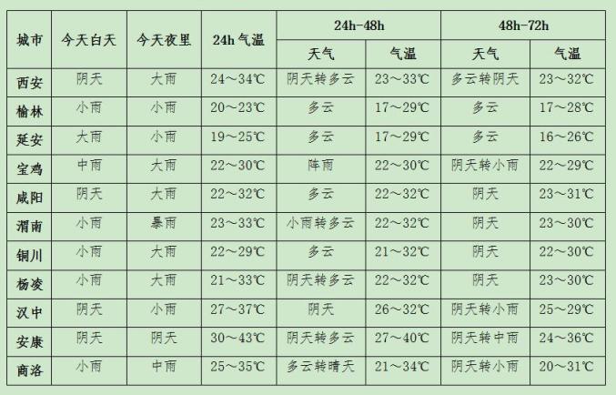 22日:全省阴天,陕北、关中有小到中雨,陕南有中到大雨。