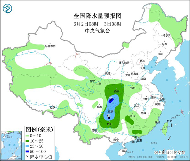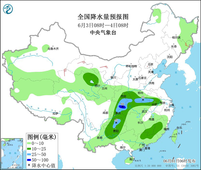 未来三天,青海东部、甘肃南部、陕西南部、四川东部和南部、重庆以及贵州等地部分地区将有中到大雨,局地有暴雨到大暴雨。6月1日,内蒙古东部、东北地区有小到中雨或雷阵雨,局地有大到暴雨,并伴有雷暴大风、冰雹和短时强降水等强对流天气。中央气象台6月1日06时发布强对流天气蓝色预警。6月9-10日起,华南、江南南部有中到大雨,华南南部部分地区有暴雨。
