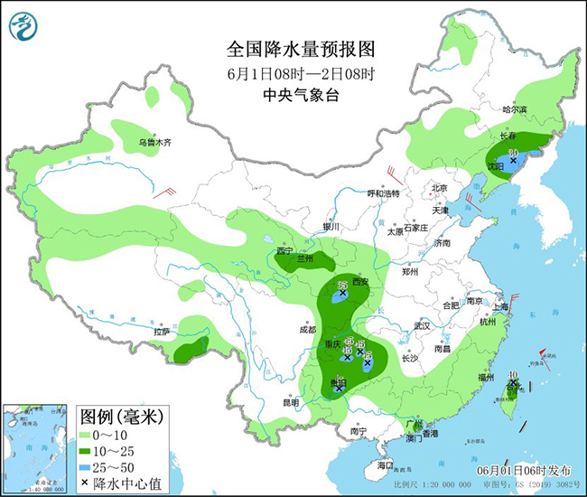 6月1日08时至2日08时,吉林中南部、辽宁中北部、甘肃南部、陕西南部、湖南西部、西南地区东部、台湾岛等地部分地区有中到大雨(25~45毫米)。内蒙古中东部、新疆南疆盆地等地部分地区有4~6级风。巴士海峡、台湾海峡、南海东北部、东海等海域将有6~8级、阵风9~10级的大风,其中台湾以东洋面和东海东南部部分海域风力可达9~10级、阵风11~12级(见图1)。