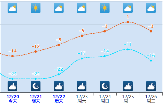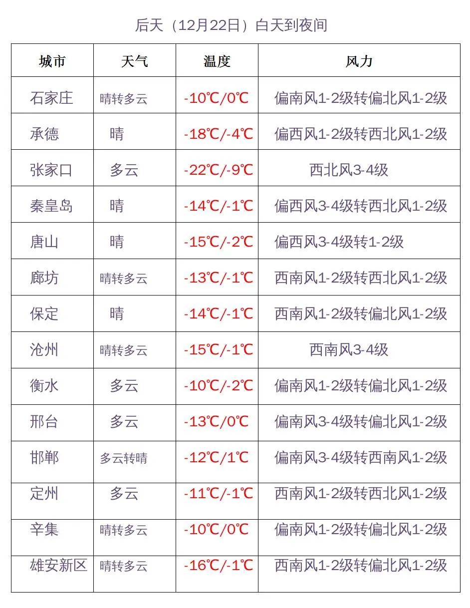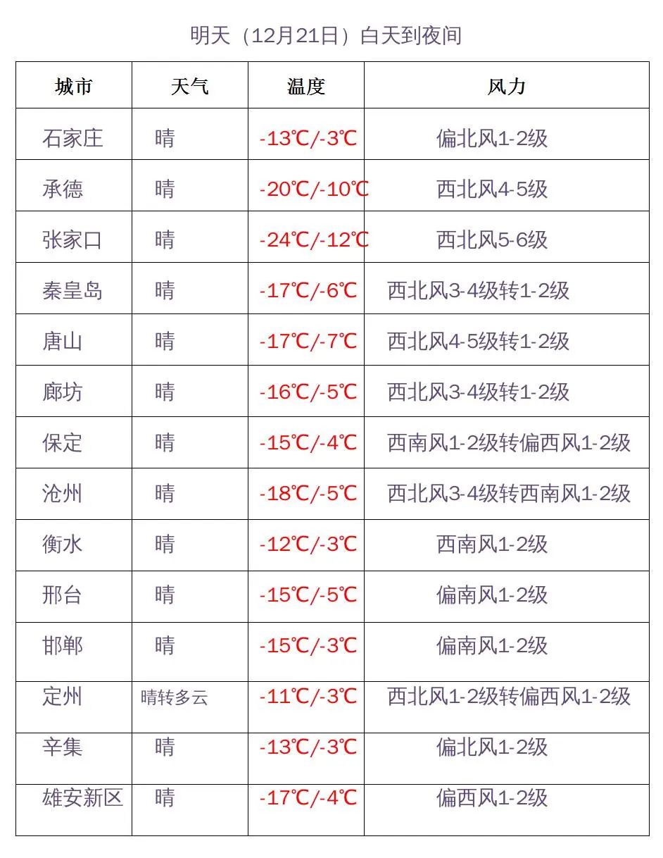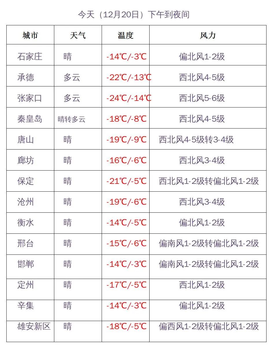 今天,最高气温,张家口、承德、保定西北部-25~-12℃,其他地区-11~-4℃。最低气温,张家口、承德、秦皇岛北部、保定西北部-33~-20℃,其他地区-20~-13℃。