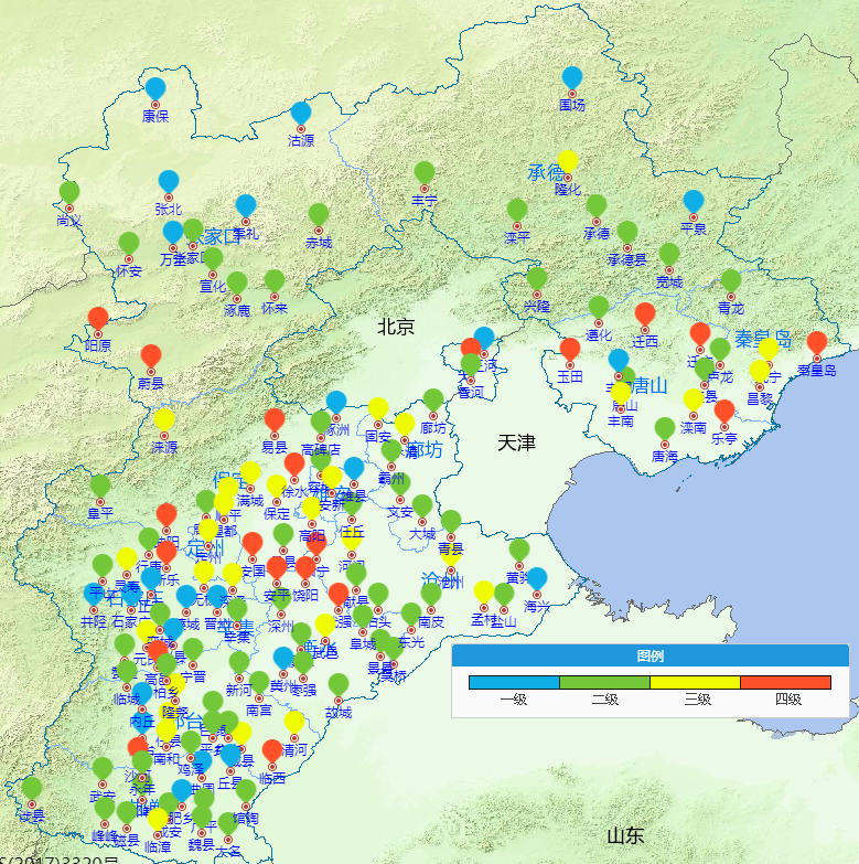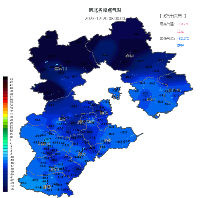 受冷空气影响,今天气温表现低迷,8时,全省气温跌至-10℃以下,张家口和承德大部气温在-20℃以下,最低值出现在蔚县,为-32.2℃。