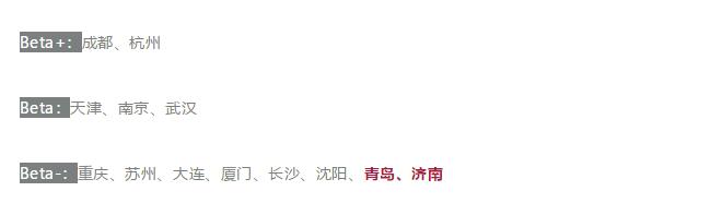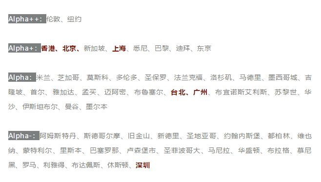 这份榜单则被认为是全球最权威的世界城市排名,GaWC以其独特视角对城市进行Alpha,Beta,Gamma,Sufficiency(+/-)划分(即:全球一二三四线),以表明城市在全球化经济中的位置及融入度。