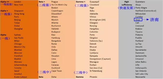 GaWC将世界城市分为四个大的等级——Alpha(一线城市)、Beta(二线城市)、Gamma(三线城市)、Sufficiency(自给自足城市,也可以理解为四线城市),而每个大的等级中又区分出多个带加减号的次等级。
