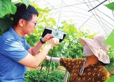 东丽区胡张庄村,一排排设施大棚在骄阳炙烤下整齐排列,其中一个大棚里是村民曹先云种植的阳光玫瑰葡萄,果绿色的葡萄已经进入膨大期。“这个阶段的葡萄,湿度得大,要不温度突然升高,叶片蒸腾加大,根部得不到充足水分,叶片就会强制从果实里吸取水分,形成气灼。”曹先云观察着葡萄长势,又到棚内挂着的一个装置前进行擦拭。她擦拭的装置是“丰聆”便携式智能监测设备,是集成了空气温度、空气湿度、光照度,并航插外接土壤温度、土壤湿度的五要素微型气象站。该设备小巧便捷,可屏幕显示,可远程查阅,自带锂电池并连接太阳能板,可依据现场实际情况进行悬挂或地插安装。农户利用这一设备,能随时了解到自家大棚中作物生长的小气候环境,并及时有效培育。
