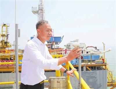 我国渤海唯一海上有人观测站,气象观测员杨文杰正在维护气象设施。