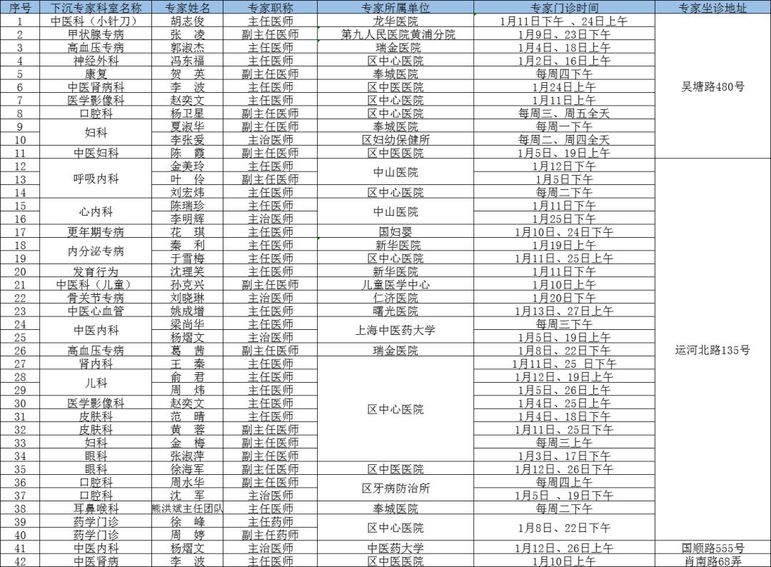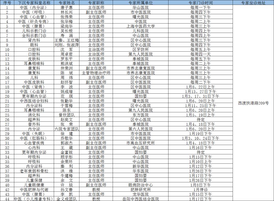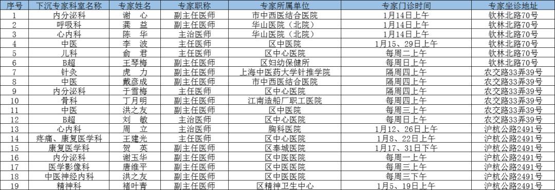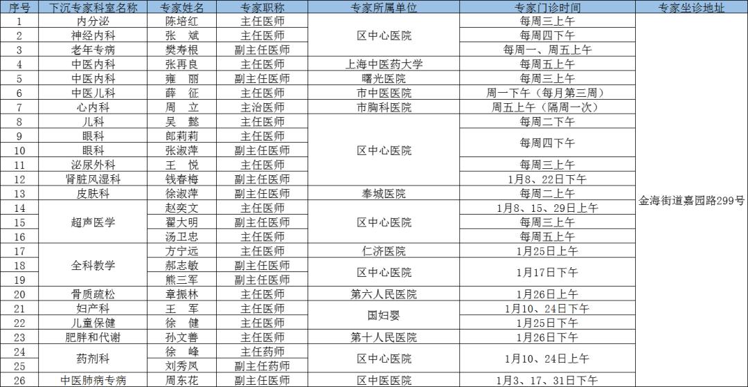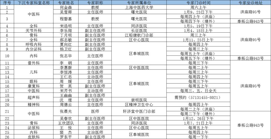 为切实解决百姓家门口看病难问题、促进优质医疗资源下沉,提升居民健康管理水平,在市属医院、区级医联体单位的支持下,奉贤区现开展“专家下沉社区”门诊,2024年1月份专家门诊时间一览见下表: