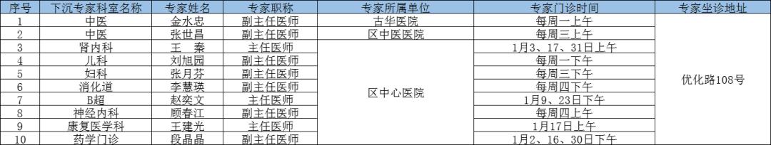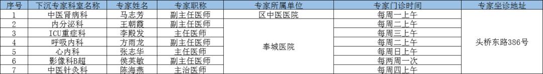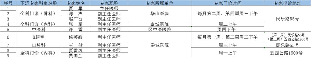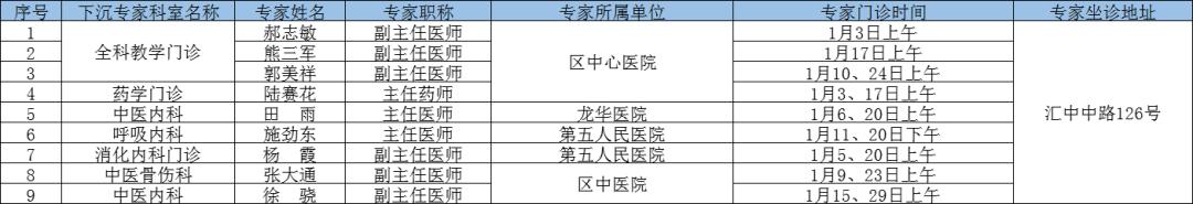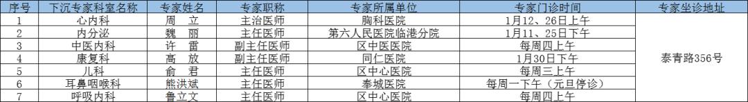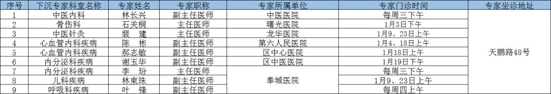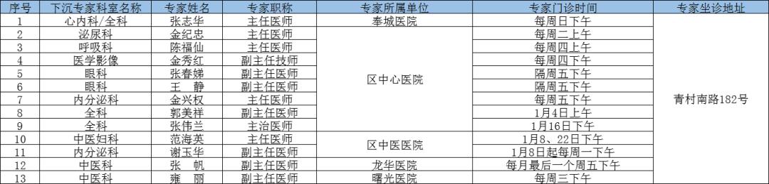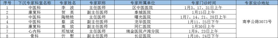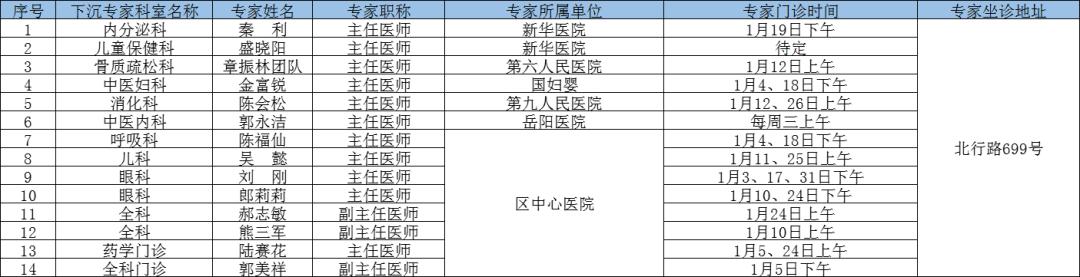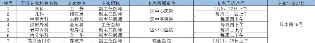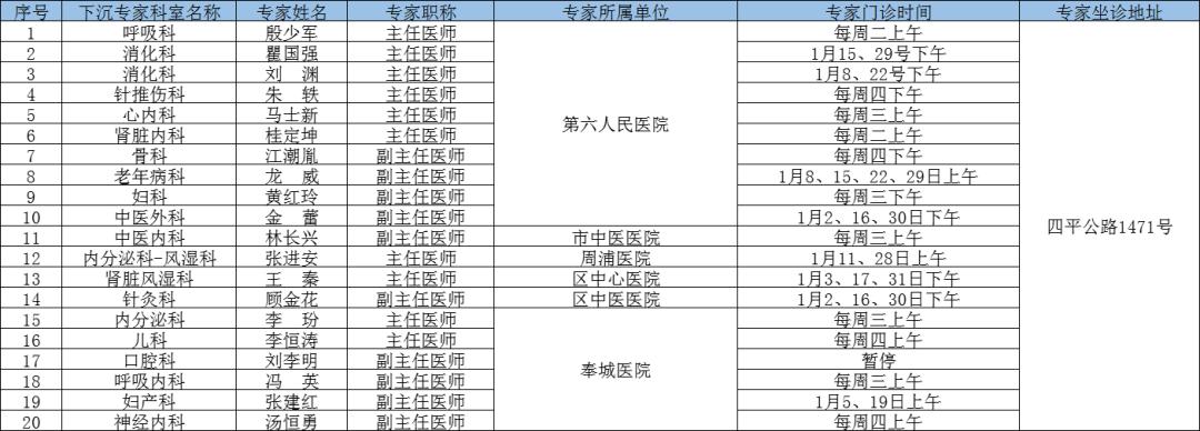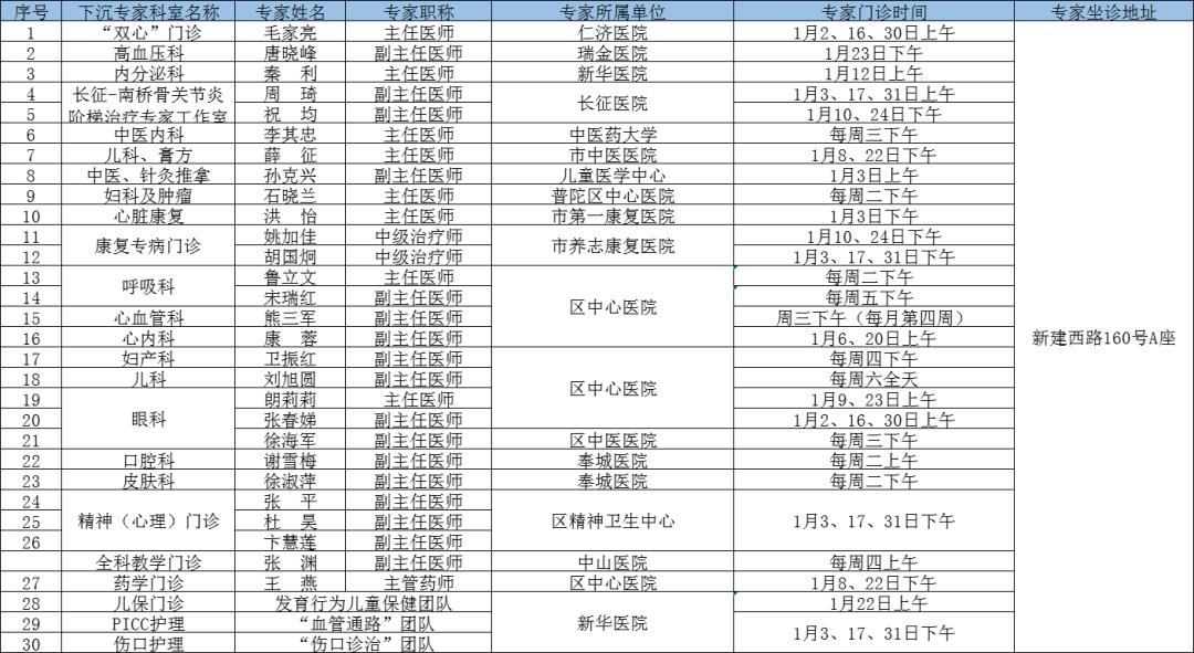 为切实解决百姓家门口看病难问题、促进优质医疗资源下沉,提升居民健康管理水平,在市属医院、区级医联体单位的支持下,奉贤区现开展“专家下沉社区”门诊,2024年1月份专家门诊时间一览见下表: