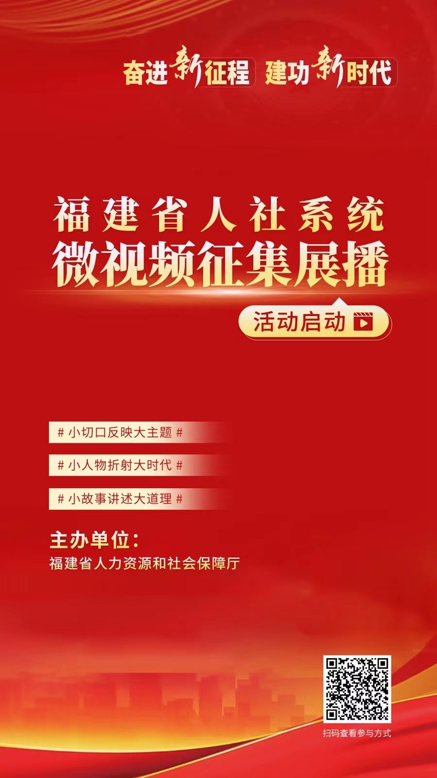 近日,福建省人力资源和社会保障厅推出福建省人社系统“奋进新征程 建功新时代”微视频征集展播活动。本次活动立足新时代人力资源和社会保障工作的要求,把深入开展“再学习、再调研、再落实”活动、大力实施“提高效率、提升效能、提增效益”行动与推进“10+3”重点工作项目结合起来,向福建全省人社系统广泛征集优秀微视频作品,集中展示党的十八大以来,全省人社系统的改革发展成果,展示人社系统干部职工精神风貌,传递福建人社人“牢记使命 奋斗为民”的好声音、好故事。