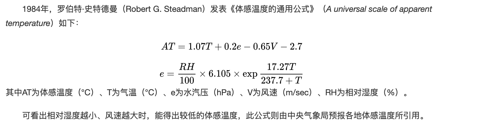 人们实际感受到的气温可要复杂多了。体感温度是指人体在不同环境下感受到的空气温度。在相同的气温条件下,人们会因湿度、风速、太阳辐射、着装颜色甚至心情等不同而产生不同的冷暖感受,它有一套十分复杂的计算公式。以1984年罗伯特·史特德曼发表的体感温度通用公式来看,与体感温度相关的变量包括气温、水气压、风速、相对湿度等等。
