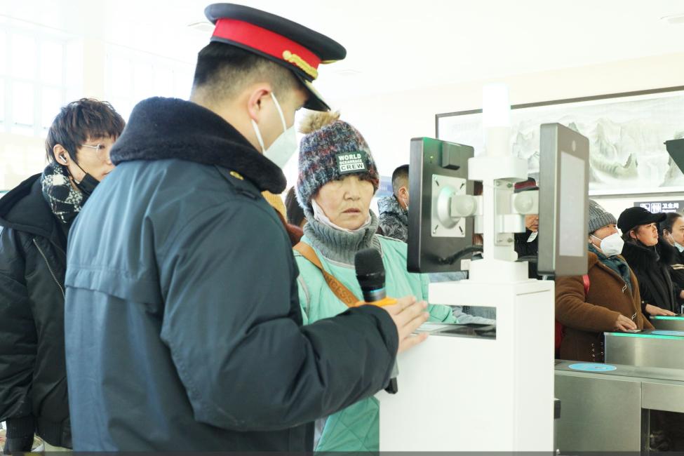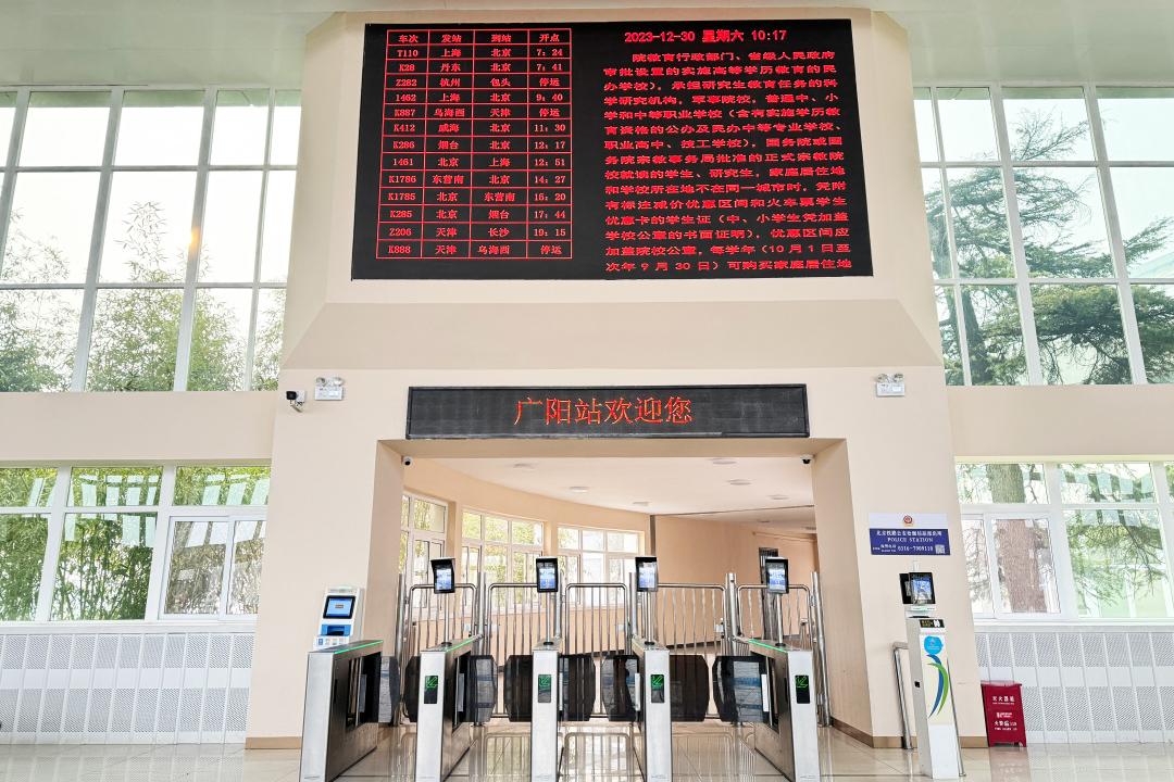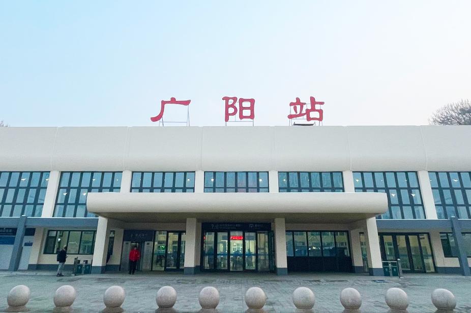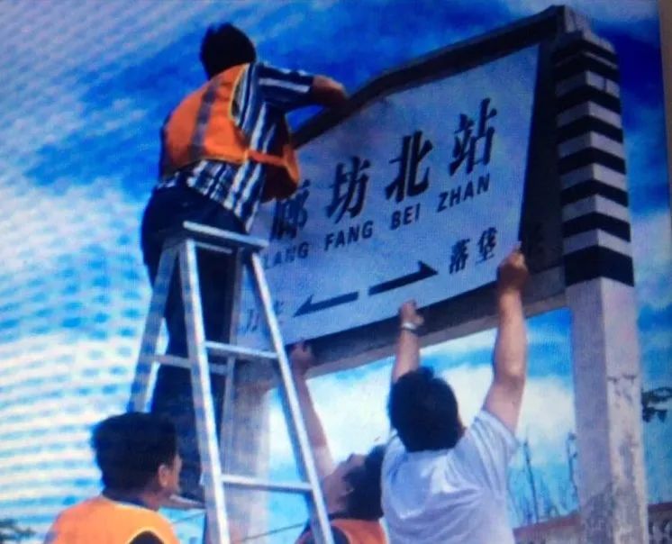 工作人员正在将站台上标有廊坊站的站名牌更换为廊坊北站