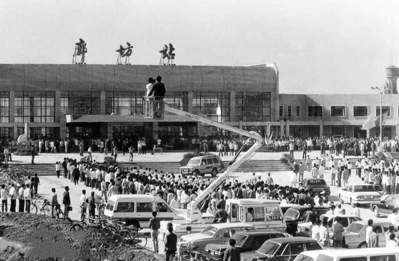1989年9月,人们聚集在站前广场庆祝廊坊站开通运营