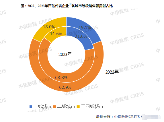 中指研究院数据显示,2023年,百亿房企仍在重点布局一、二线城市。30家百亿代表企业的一、二线城市业绩贡献合计占比达85.4%,较上年提升了3.4个百分点。