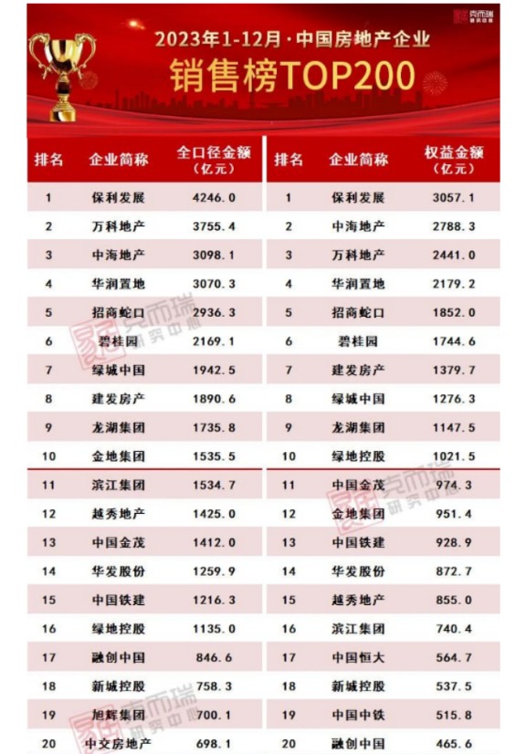 12月31日,中指研究院、克而瑞地产研究相继发布了2023年房企销售数据。综合来看,共有16家房企销售额超过千亿元,保利发展、万科地产、中海地产位列前三,且保利发展是唯一销售额超4000亿元的房企。